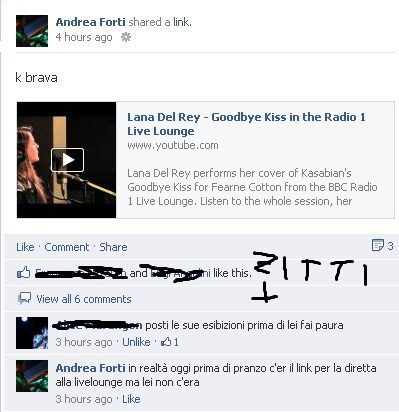 teressa che voi iniziate a dire “oooold” che tanto io ho pubblicato il link nel mio profilo quando aveva 380 visualizzazioni e nemmeno Lana Del Rey stessa l’aveva linkato nel suo profilo facebook, e la foto profilo ne è una prova.